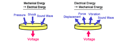 When a mechanical force or pressure is applied across piezoelectric crystal, an electric potential appears across the surfaces of crystal. This generation of electric potential is due to displacement of electric charges. On the other hand, if a varying voltage is applied across the crystal, there will be a change in the dimensions of the crystal. This phenomena is known as piezoelectric effect. Piezoelectric effect is reversible as discussed above.