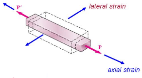 Poisson's Ratio (ν) of a material is a negative ratio of lateral strain to the longitudinal (axial) strain. It is a material specific property and is dimensionless.
