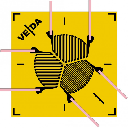Ans. The cluster of strain gauges is called the Rosettes. Practically, stress can be applied in any direction and it is not possible to orient the strain gauges along the direction of principle stress. So with the help of combination of strain gauges, it is possible to find the strain and stress values without actually knowing their directions. It is used for specific stress analysis or transducer applications. A three element rosette 60° planar (foil) is shown in figure below.