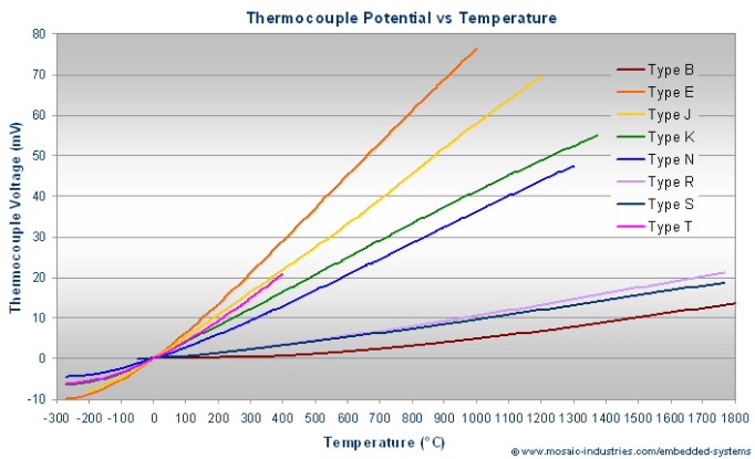 Various combination of material are used in industries and accordingly named as Type B, Type E, Type J, Type K, Type N, Type R, Type S, and Type T. The various types of thermocouples with their range and corresponding outputs are given below.