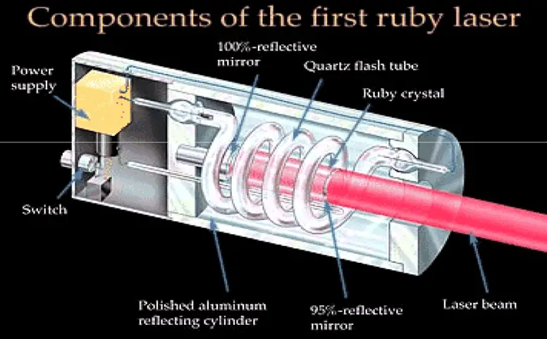 - Gain Medium: crystal of aluminum oxide (Al2O3) with a small part of atoms of aluminum is replaced with Cr3+ ions.