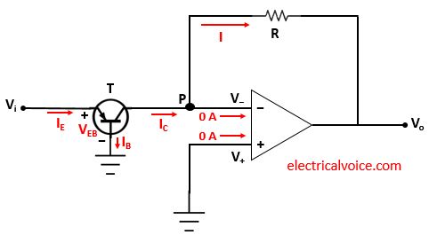 The analysis of the antilog amplifier is shown in figure 2. Since the op-amp is ideal and negative feedback is present, the voltage of the inverting terminal (V−) is equal to the voltage of the non-inverting terminal (V+ = 0V), according to the virtual short concept.