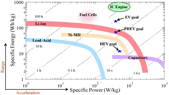 A Ragone plot is a plot of specific energy (in Wh/Kg) versus specific power (in W/Kg). It is used for performance comparison of various energy-storing devices.
