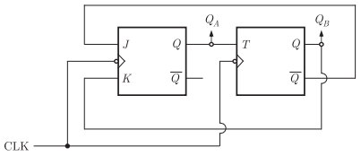 If the state QA QB of the counter at the clock time tn is ‘10’ then the state QA QB of the counter at tn + 3 (after three clock cycles) will be