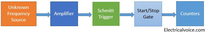 1. The unknown frequency signal is fed to the Schmitt trigger. The signal may be amplified before being applied to Schmitt trigger.