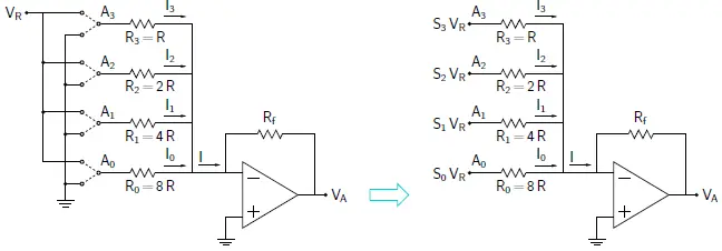 If the input bit Sk is 1, Ak gets connected to reference voltage VR; else, it gets connected to ground.