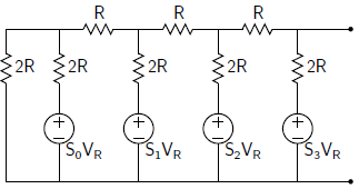 The R-2R ladder network circuit is shown below. A0 is the least significant bit and A3 is the most significant bit. Node Ak (k=0,1,2,3….) is connected to reference voltage VR if input bit Sk is 1; else, it is connected to ground.