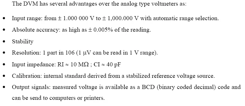 A digital voltmeter (DVM) is truly a voltage measuring unit where unknown analog DC voltage is to be measured i.e. first converted to digital form and then displayed on seven segment display. The accuracy, versatility, precision, robustness of Digital electronic devices cannot be matched with that of Analog devices as the former ones are far more superior.