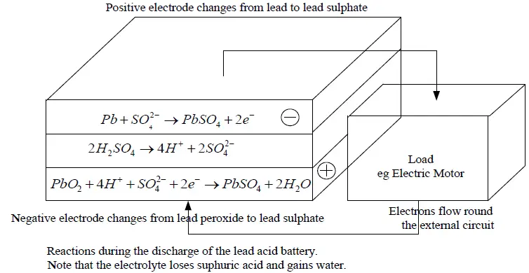 The sulphuric acid (H2SO4) combines with the lead and the lead dioxide to produce lead sulphate (PbSO4) and water, electrical energy being released during the process.