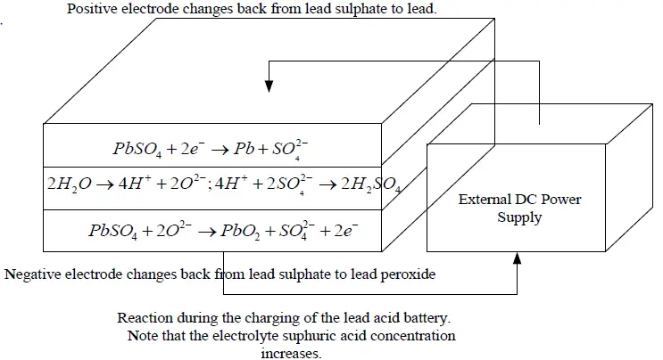 When being charged, the electrodes revert to lead and lead dioxide. The electrolyte also recovers its sulphuric acid, and the concentration rises.