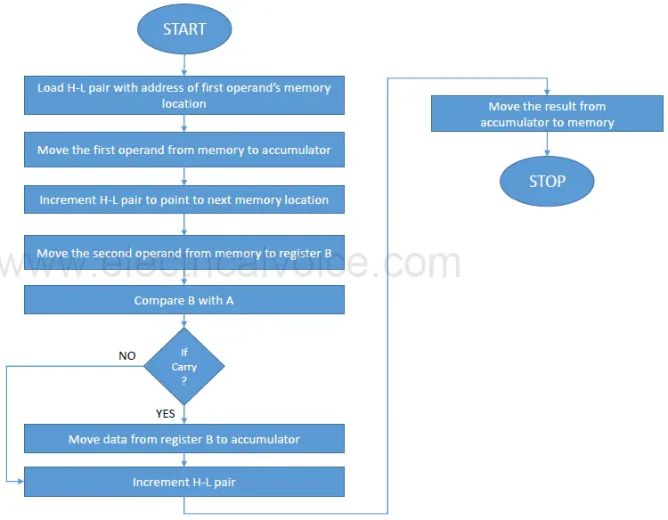 Q. Write a program and draw a flowchart to find the Largest of two 8-bit numbers.(8085 Microprocessor Program)