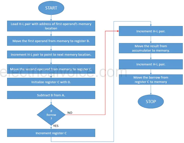 Q. Write an 8085 program and draw a flowchart to Subtract two 8-bit numbers along with considering the borrow.(8085 Microprocessor Program)
