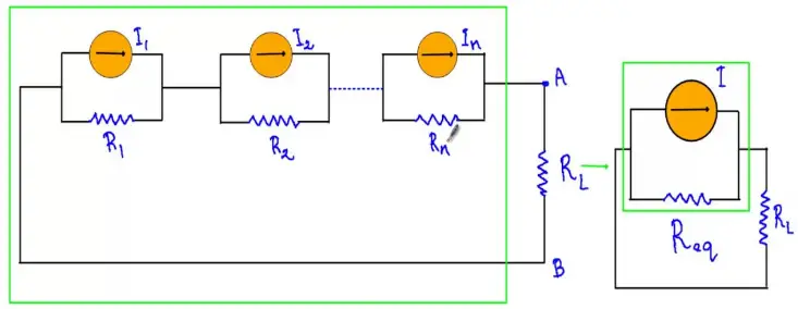The theorem states that if several ideal current sources I1, I2, I3,……., In are in parallel with resistances R1, R2, R3,…….., Rn, are connected in series then the circuit may be replaced by a single ideal current source I in parallel with the resistance Req such that
