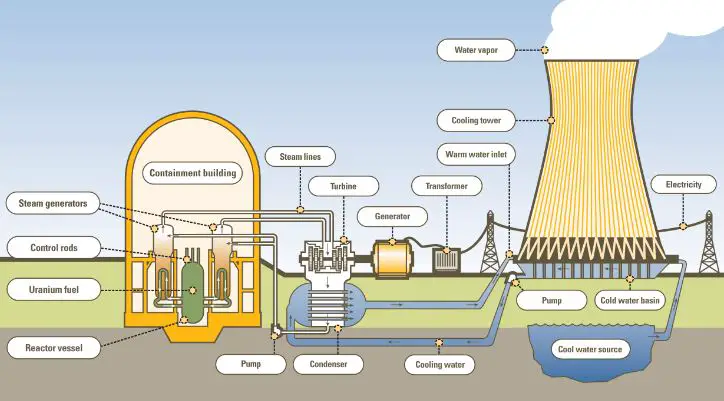 In a nuclear power station, heavy elements such as Uranium (U235) or Thorium (Th232) are subjected to nuclear fission. in a special apparatus known as a reactor. The heat energy thus released is utilized in raising steam at high temperatures and pressure. The steam runs the steam turbine which converts steam energy into mechanical energy. The turbine drives the alternator which converts mechanical energy into electrical energy.