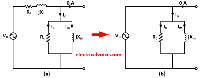 Figure 2(a) shows the equivalent circuit when open circuit test on transformer is performed. As we know that the no-load current is very small i.e. 2 to 5 % of the full load current. Hence the voltage drop in the LV winding can be neglected. Hence equivalent circuit becomes as shown in figure 2(b).