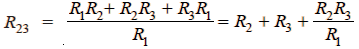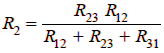 R2 is equal to the product of resistances connected at node 2 divided by the sum of three resistances in delta connection.