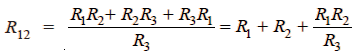 The equivalent delta resistance between any two terminals is given by the sum of star resistances between those terminals plus the product of these two-star resistances divide by the remaining third-star resistances.