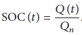 The SOC of a battery is defined as the ratio of its current capacity (Q(t)) to the nominal capacity (Qn). Nominal Capacity, Qn, is the maximum amount of charge that can be stored in the battery. This rating is given by the manufacturer.