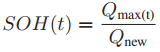 The SOH of a battery is defined as the ratio of its maximum instantaneous releasable capacity, (Qmax(t)) to the capacity of the new battery (Qnew).