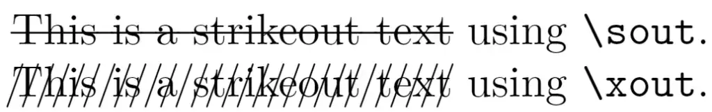 To strikethrough text, use the \sout{} command. Place the text you want to strike through inside the curly braces. Here’s an example: