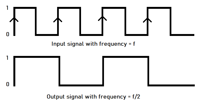 Here a positive edge-triggered T flip-flop has been used. The control input T is kept HIGH i.e. T=1 and the original signal is given to clock or enable pin. Now when a positive edge occurs at the clock input, the flip-flop goes to the Toggle mode, and output changes. After the edge is passed, the flip-flop moves to the memory state. Suppose, now, the output of the flip-flop is 1. Then for the next positive edge, the flip-flop again moves to toggle mode and the output changes to 0. Then for the next positive edge, the output becomes 1 again and this goes on. Thus, for a full cycle of the original signal we get a half cycle at the output i.e., the output signal’s frequency is half of the original signal’s frequency.