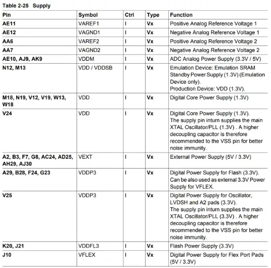 Note that different microcontrollers may have different supply voltage requirements, and the specific supply voltage needs to be determined according to the specific datasheet. The following lists several supply voltage values for the Infineon Aurix TC3XX family.
