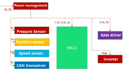 - Sensors: There are various types of sensors in automotive controllers, such as temperature sensors, pressure sensors, position sensors, and speed sensors. These sensors are typically supplied with 3V to 5V or a little higher 12V and must be provided through the power management system.