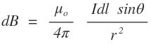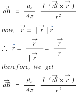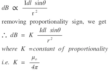 Consider a very small element PQ of length dl of a conductor carrying current I. The strength of magnetic field dB due to this small current element at a point N at a distance r from the element is found to be depending upon quantities as under.